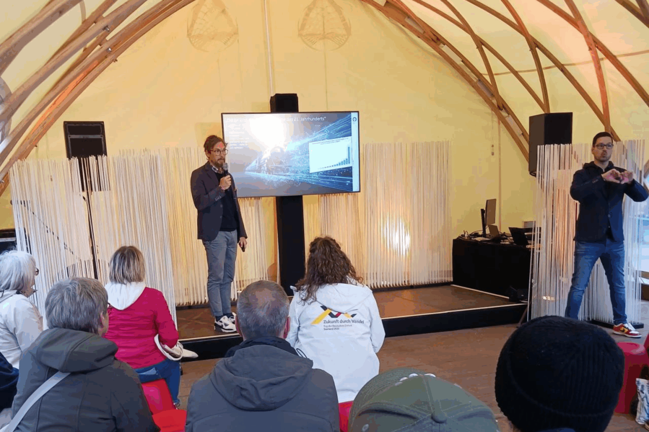 Im Dialogforum des Deutschlandfests sprach Sebastian Kreibich über die entscheidende Rolle von Mensch und Technologie für die Zukunft des Wirtschaftsstandorts Saarland. In seinem Vortrag „Wirtschaft im Wandel – KI und Mensch für die digitale Transformation im Saarland“ stellte er drei zentrale Punkte heraus: